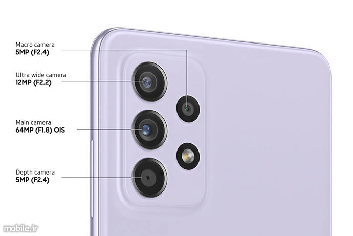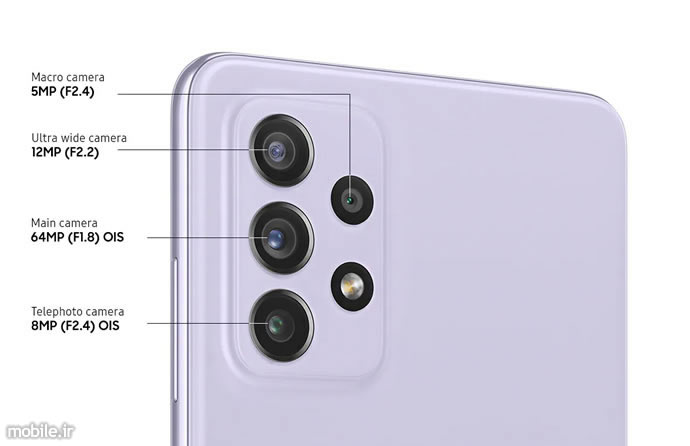 دوربین اصلی گوشی یک نمونه 64 مگاپیکسلی با گشودگی دیافراگم f/1.8 است که بالاخره بعد از سه نسل متوالی در سری A5x سامسونگ به لرزهگیر اپتیکال یا OIS مجهز شده و پیکسلهای 0.8 میکرونی آن در هنگام عکاسی با وضوح پیشفرض 16 مگاپیکسلی به 1.6 میکرون افزایش ابعاد پیدا میکنند. سه ماژول دیگر حاضر در این قسمت ظاهرا همان موارد حاضر در A51 بوده و شامل یک 12 مگاپیکسلی f/2.2 بدون فوکوس خودکار با میدان دید 112 درجهای، یک 5 مگاپیکسلی f/2.4 برای برداشت ماکرو و یک سنسور عمق میدان 5 مگاپیکسلی میشوند.